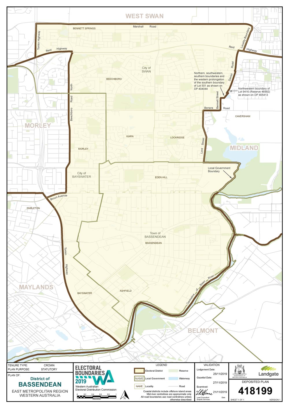 Bassendean lies in the eastern suburbs of Perth and runs from the Swan River to Marshall Road in the north, generally east of the Tonkin Highway and Beechboro Road North. The electorate includes the suburbs of Bennett Springs, Beechboro, Kiara, Lockridge, Ashfield, Bassendean, Eden Hill, and parts of Bayswater, Morley and Caversham. [Source: ABC]